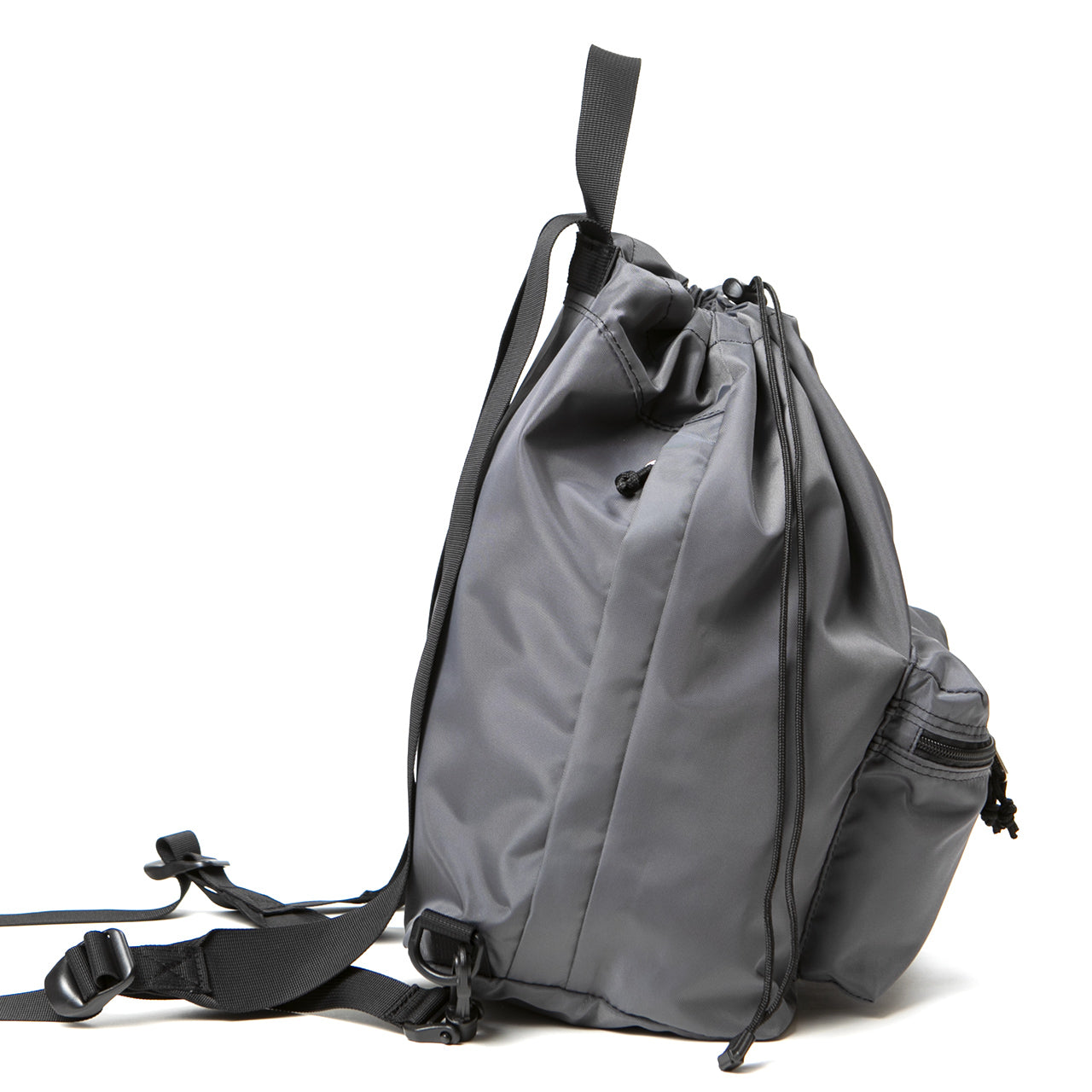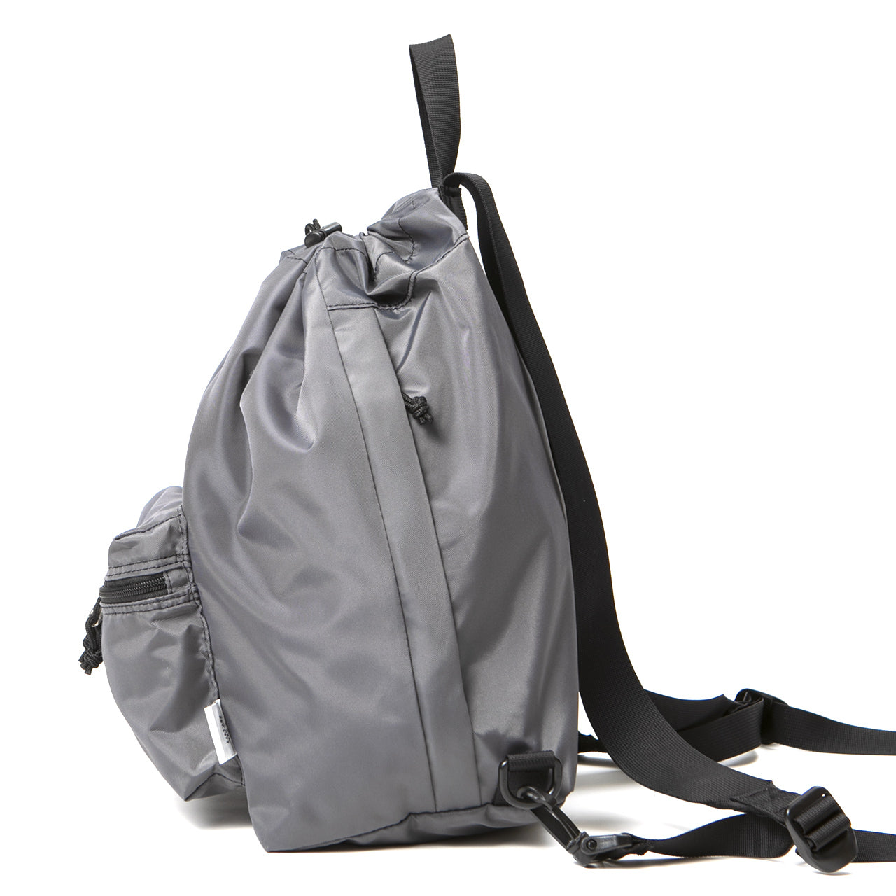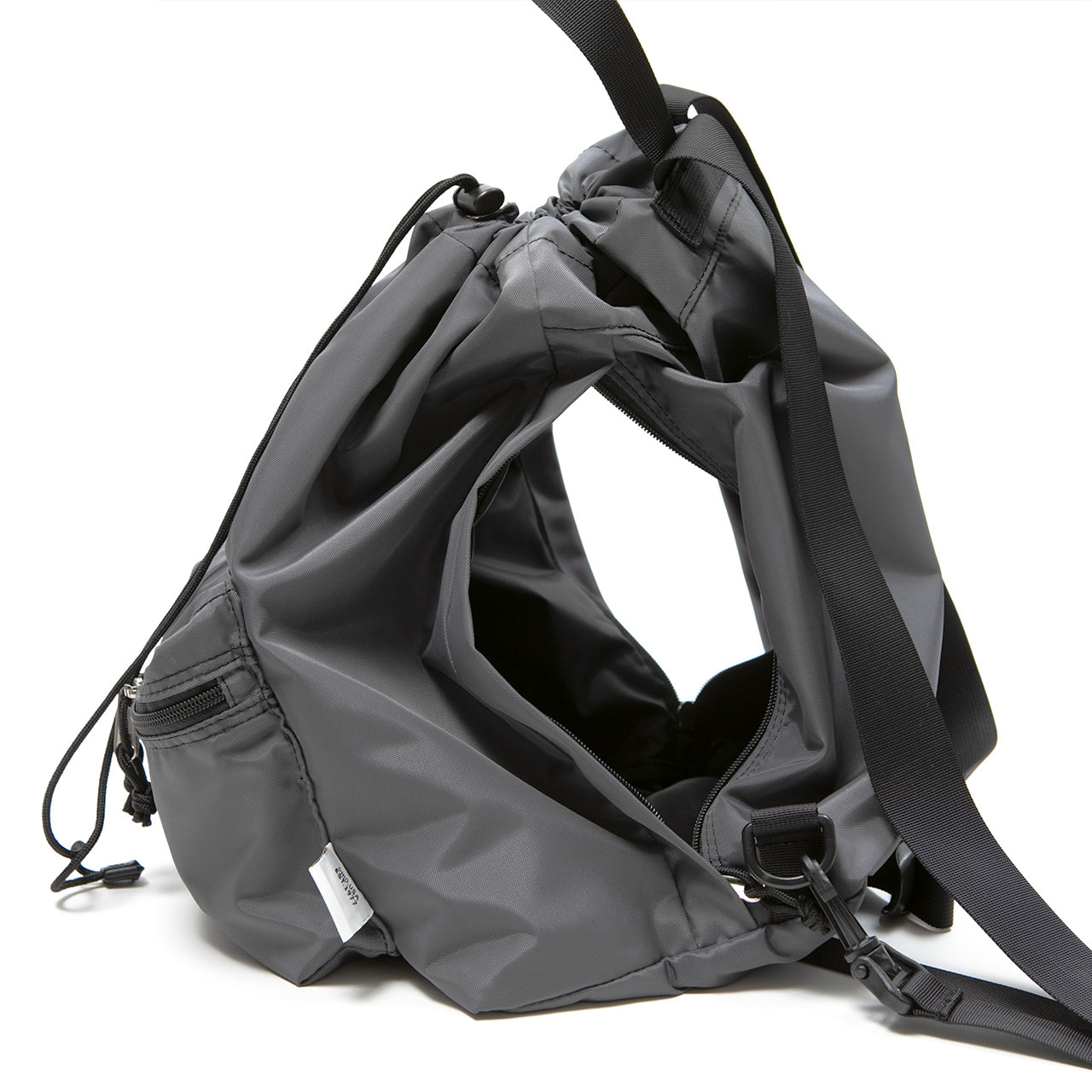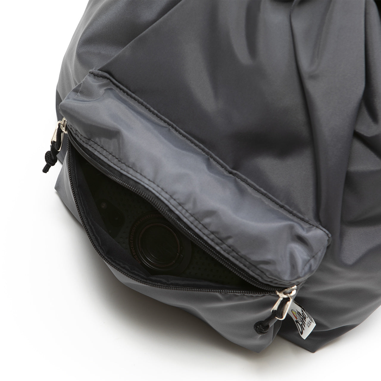 This one-shoulder (sling) bag/backpack can be used in two ways depending on how the straps are attached. By attaching both straps to the plastic D-ring at the bottom of the bag, it transforms into a one-shoulder sling style that is easy to carry and allows for freedom of movement. The front ZIP pocket with gussets and the open pocket on the inside are ideal for storing a wallet or small items that you need to access frequently. Additionally, the “Easy Access Zipper” is positioned on both sides, allowing access to the main compartment without opening the drawstring on the top. This enables you to retrieve or store items without removing the bag.
