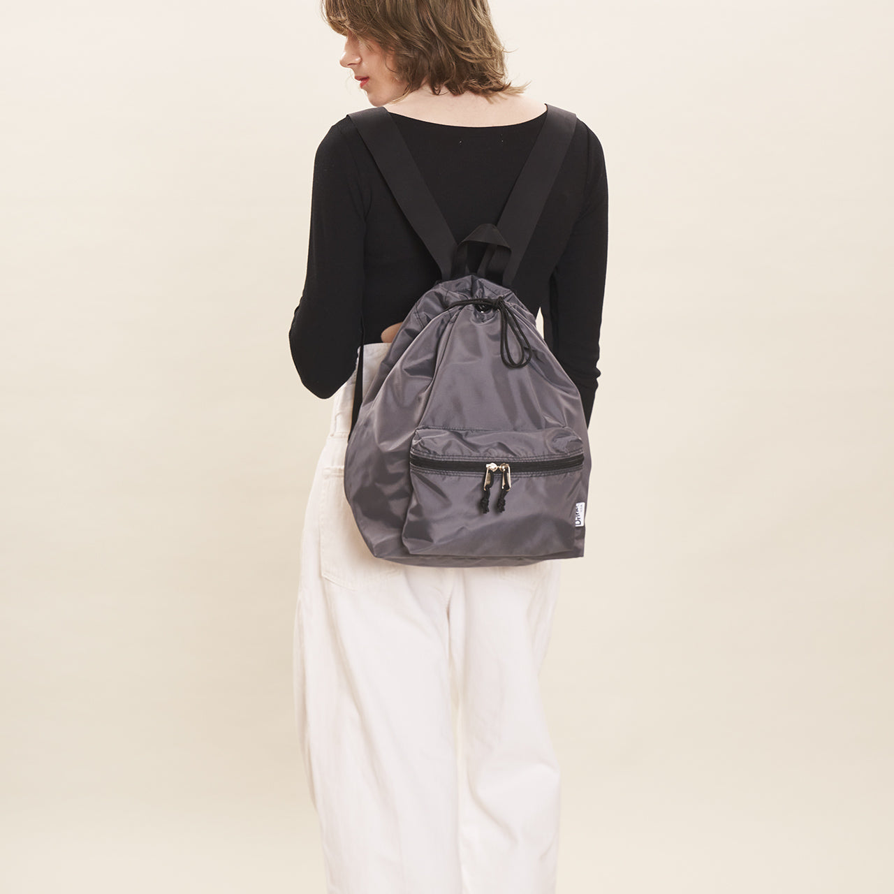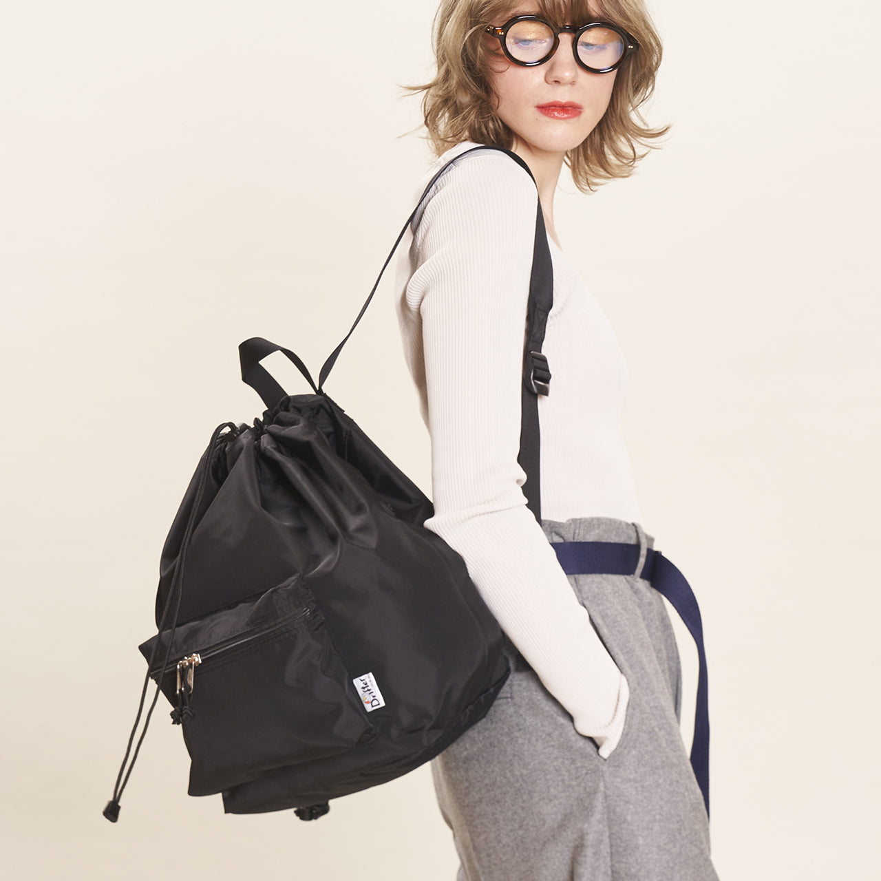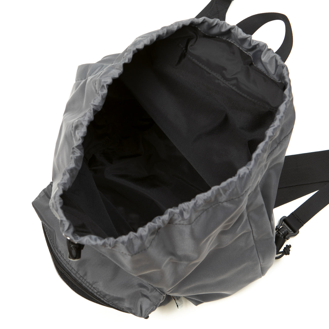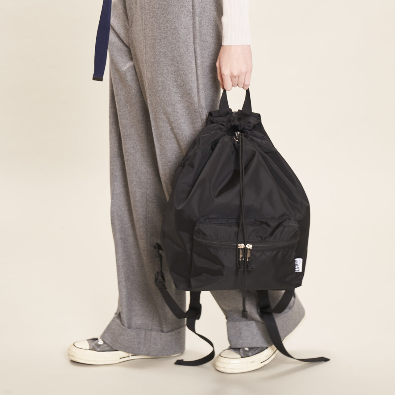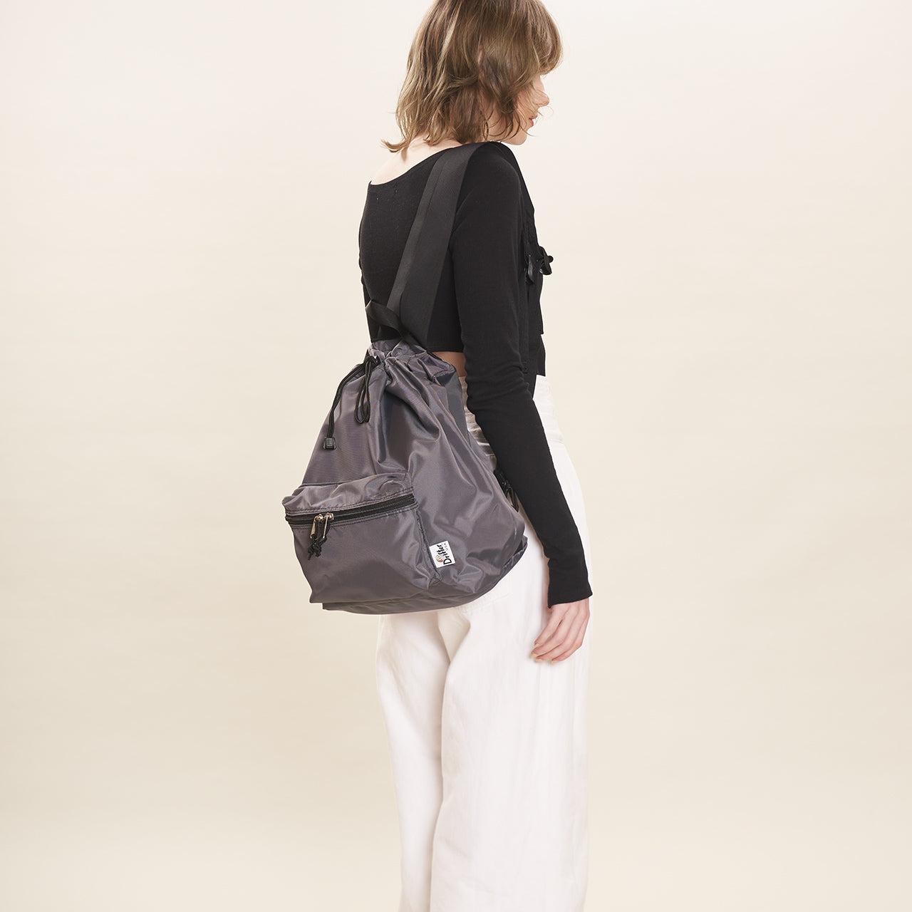 This one-shoulder (sling) bag/backpack can be used in two ways depending on how the straps are attached. By attaching both straps to the plastic D-ring at the bottom of the bag, it transforms into a one-shoulder sling style that is easy to carry and allows for freedom of movement. The front ZIP pocket with gussets and the open pocket on the inside are ideal for storing a wallet or small items that you need to access frequently. Additionally, the “Easy Access Zipper” is positioned on both sides, allowing access to the main compartment without opening the drawstring on the top. This enables you to retrieve or store items without removing the bag.