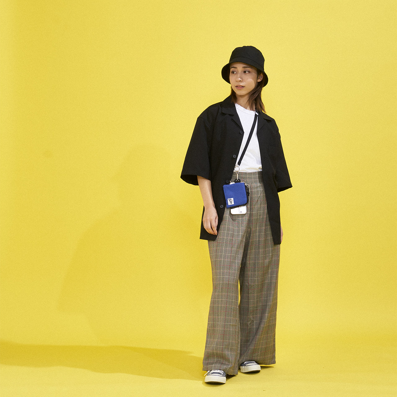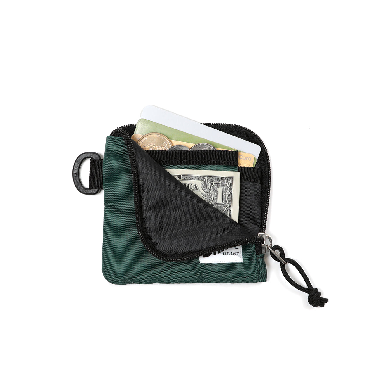 A convenient mini wallet for carrying around the bare necessities such as folded bills, coins, and cards. The internal partition is designed so that there is no spillage from your coins, so you don't have to worry about them getting mixed with cards or bills. You can also use it as a mini shoulder bag by attaching a strap to the plastic D attached on the outside.