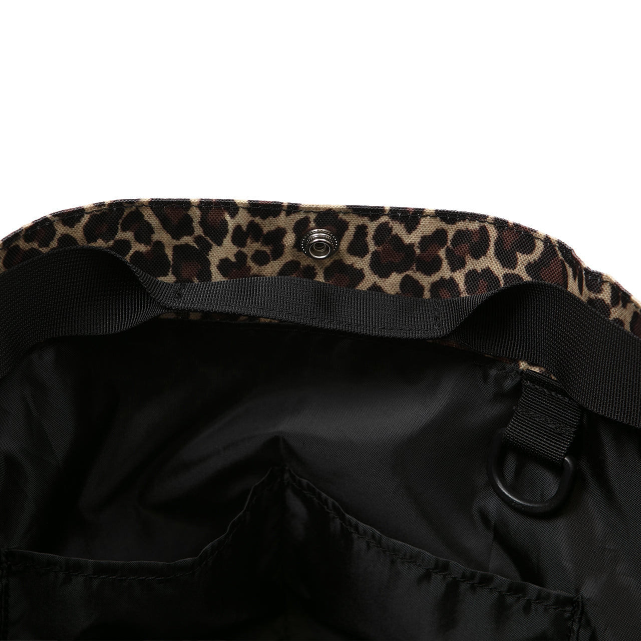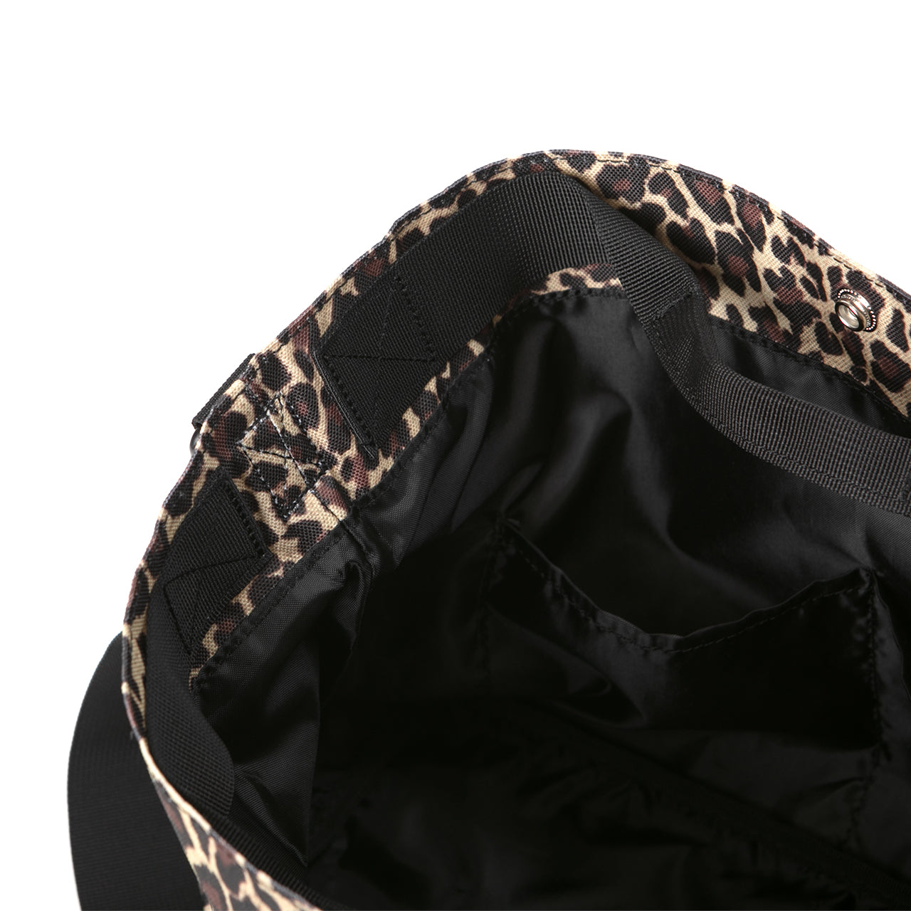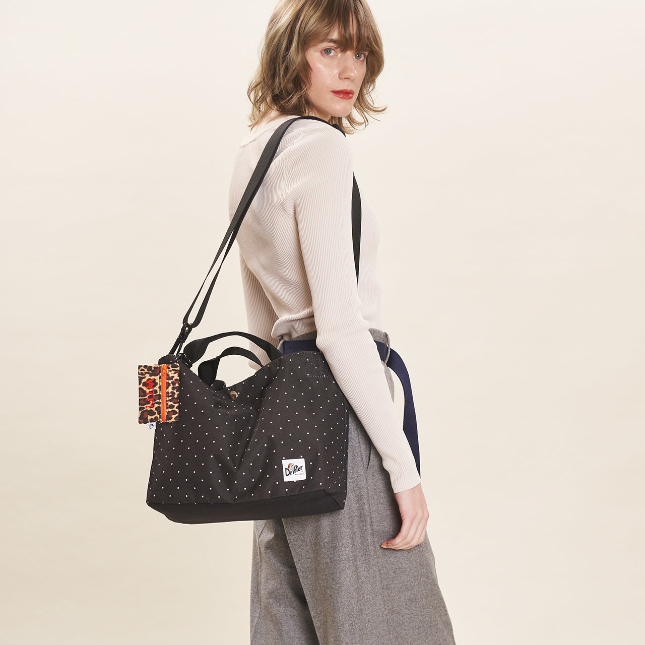A 2-way shoulder tote bag with a handle and a removable shoulder strap. Since the bottom portion is subjected to stress, the design is made with Cordura Nylon bottom, and the top part opens and closes with a snap button. There are also two open pockets on the inside that are convenient for storing smartphones, etc., and a plastic D-ring that also functions as a place for valuables such as keys so you never lose them in your bag again!