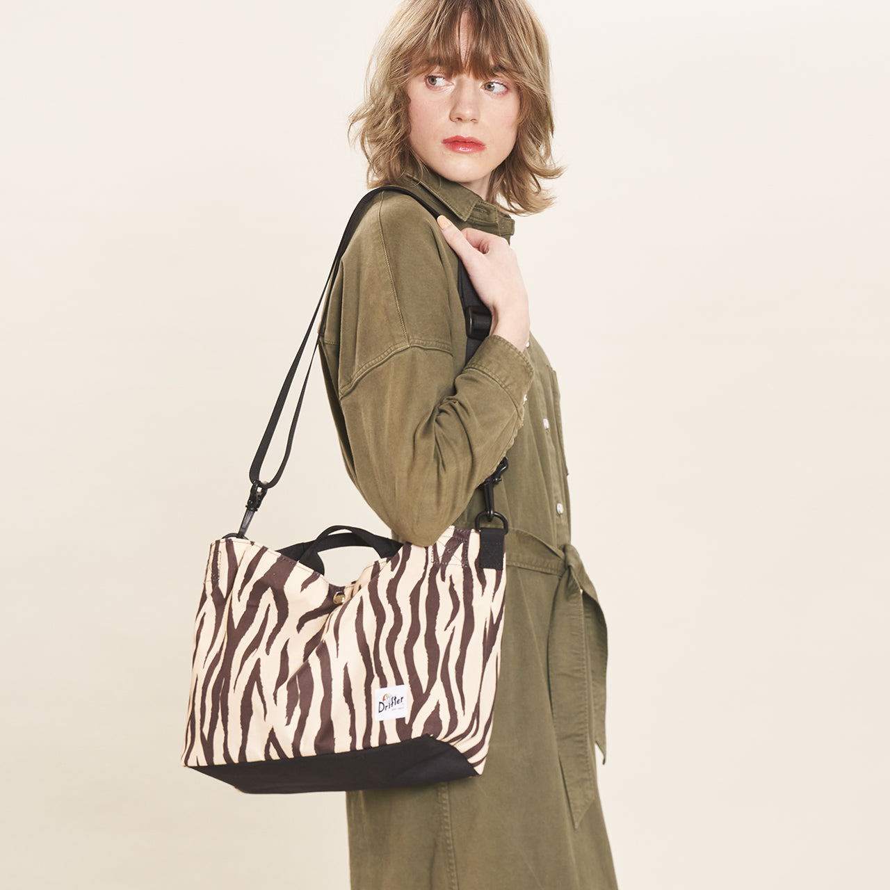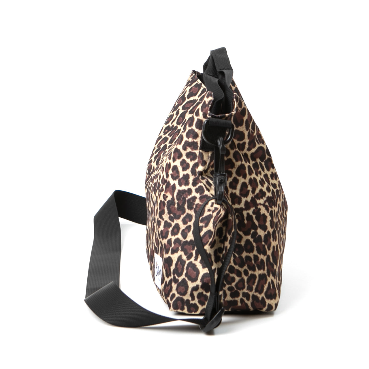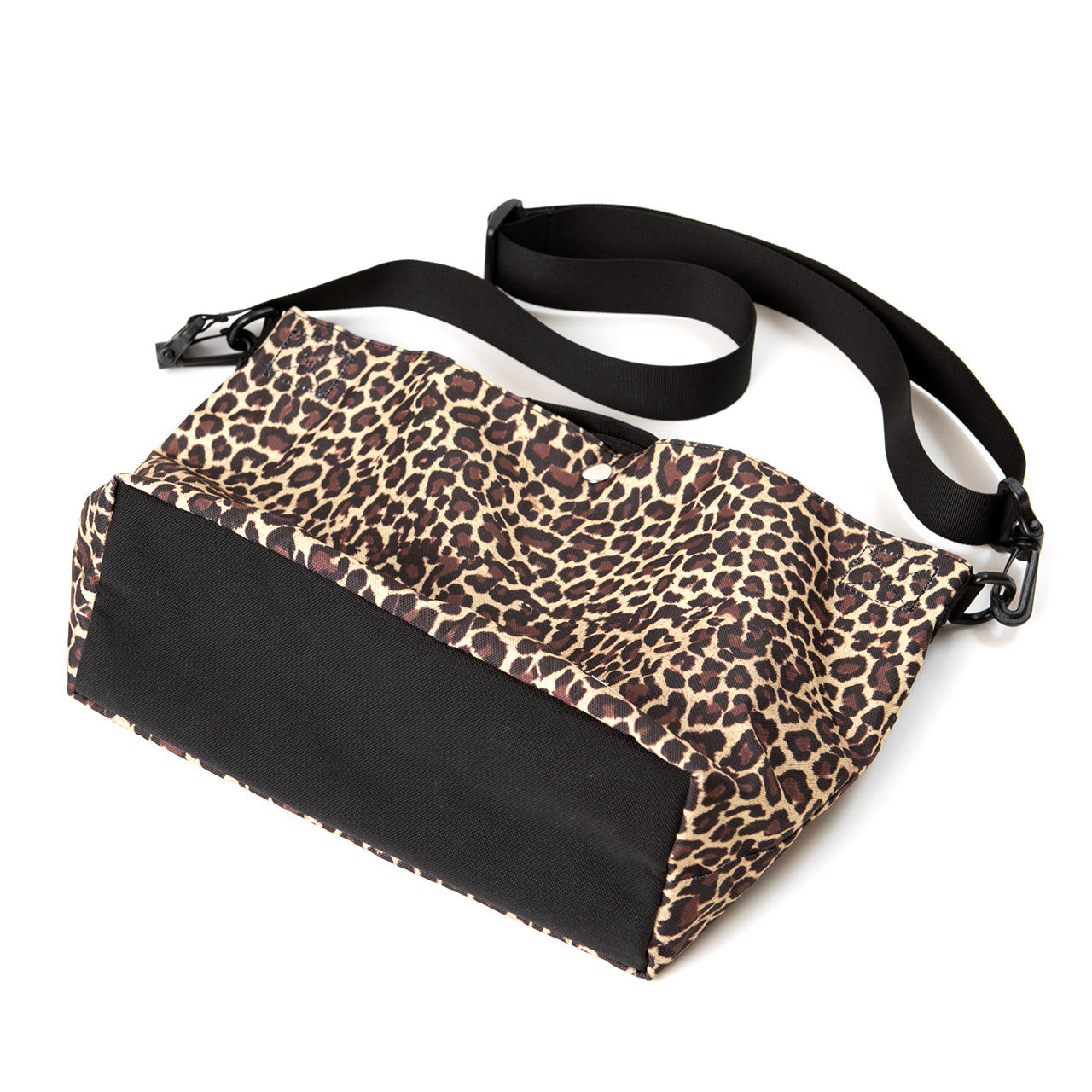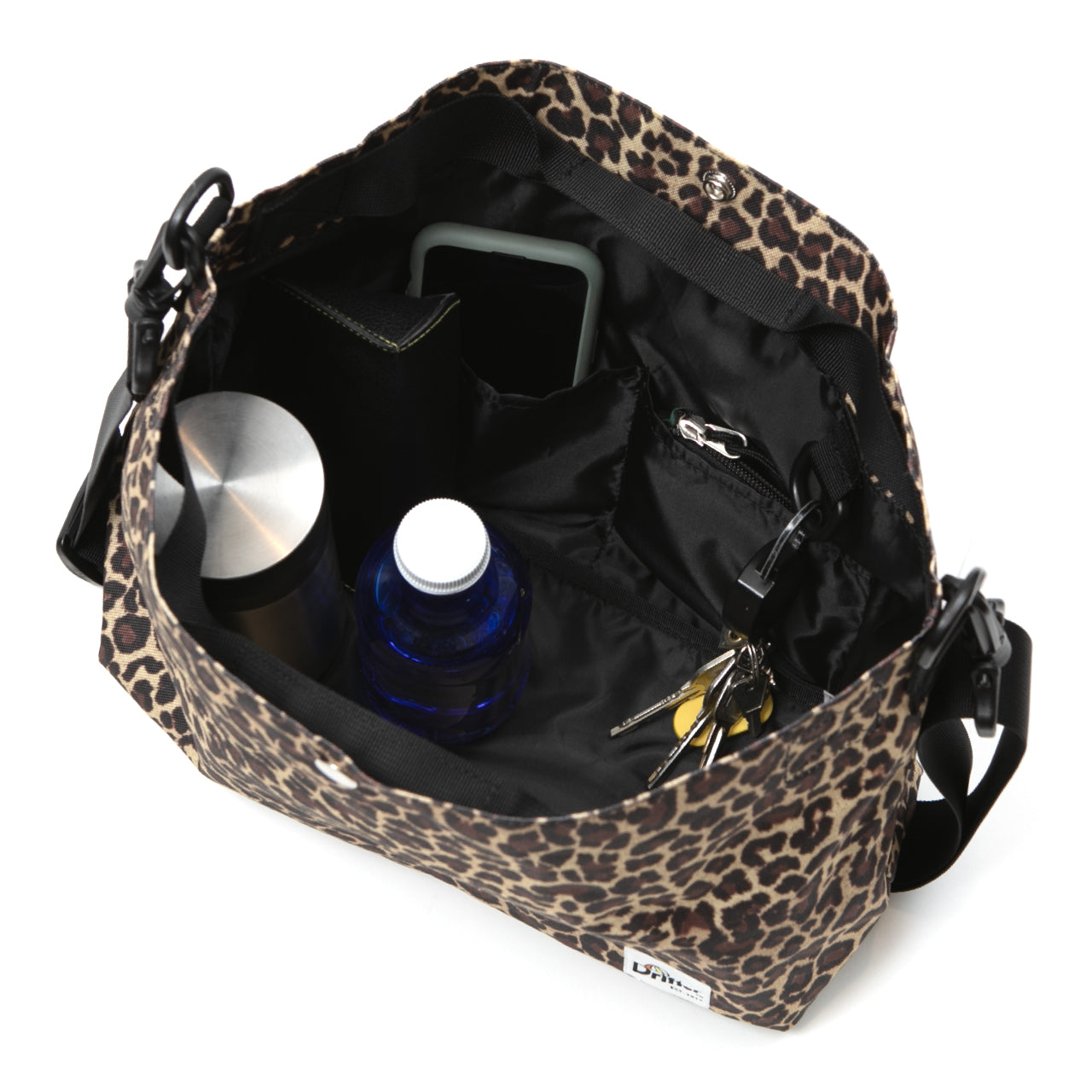 A 2-way shoulder tote bag with a handle and a removable shoulder strap. Since the bottom portion is subjected to stress, the design is made with Cordura Nylon bottom, and the top part opens and closes with a snap button. There are also two open pockets on the inside that are convenient for storing smartphones, etc., and a plastic D-ring that also functions as a place for valuables such as keys so you never lose them in your bag again!