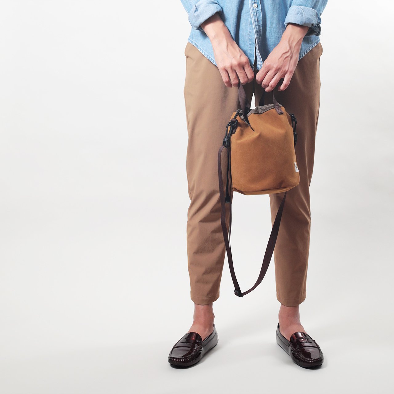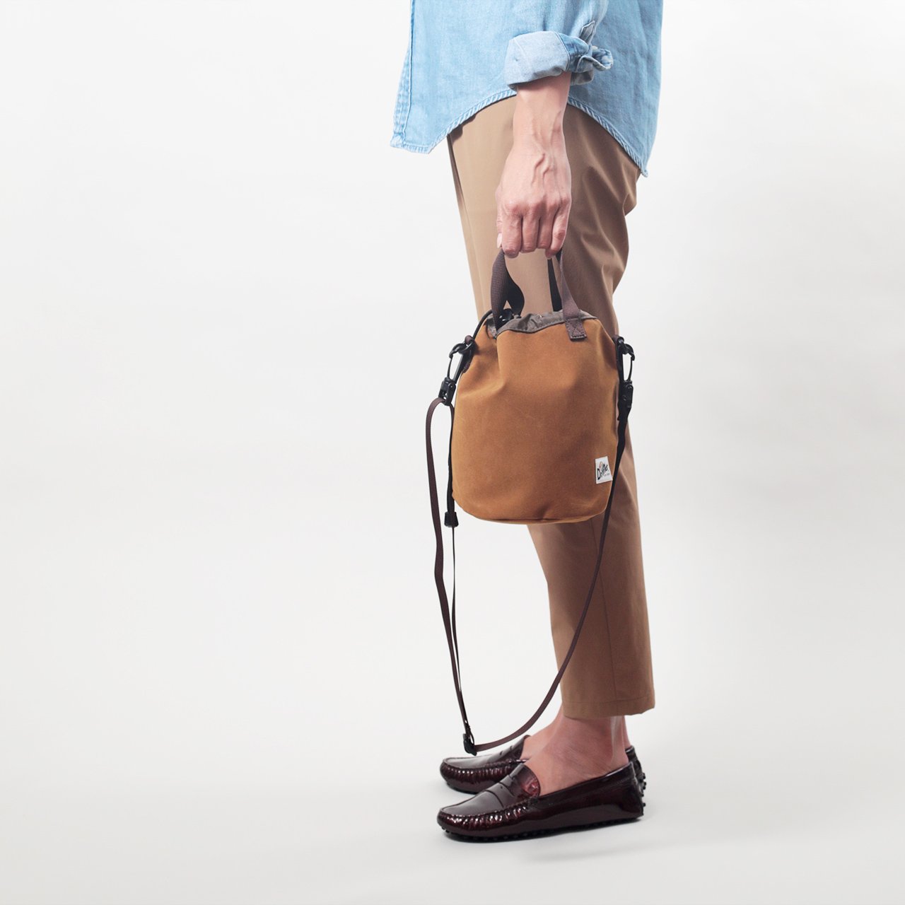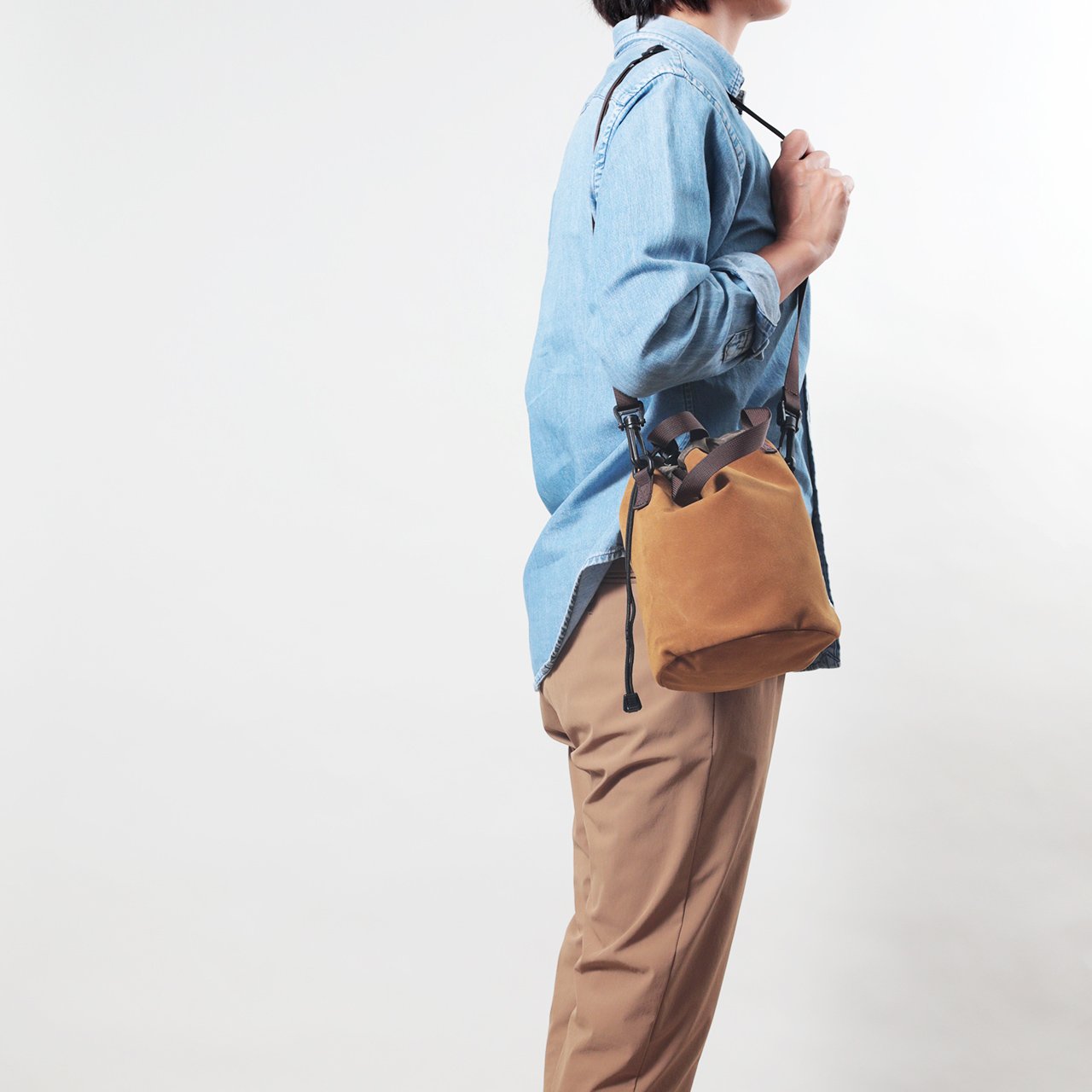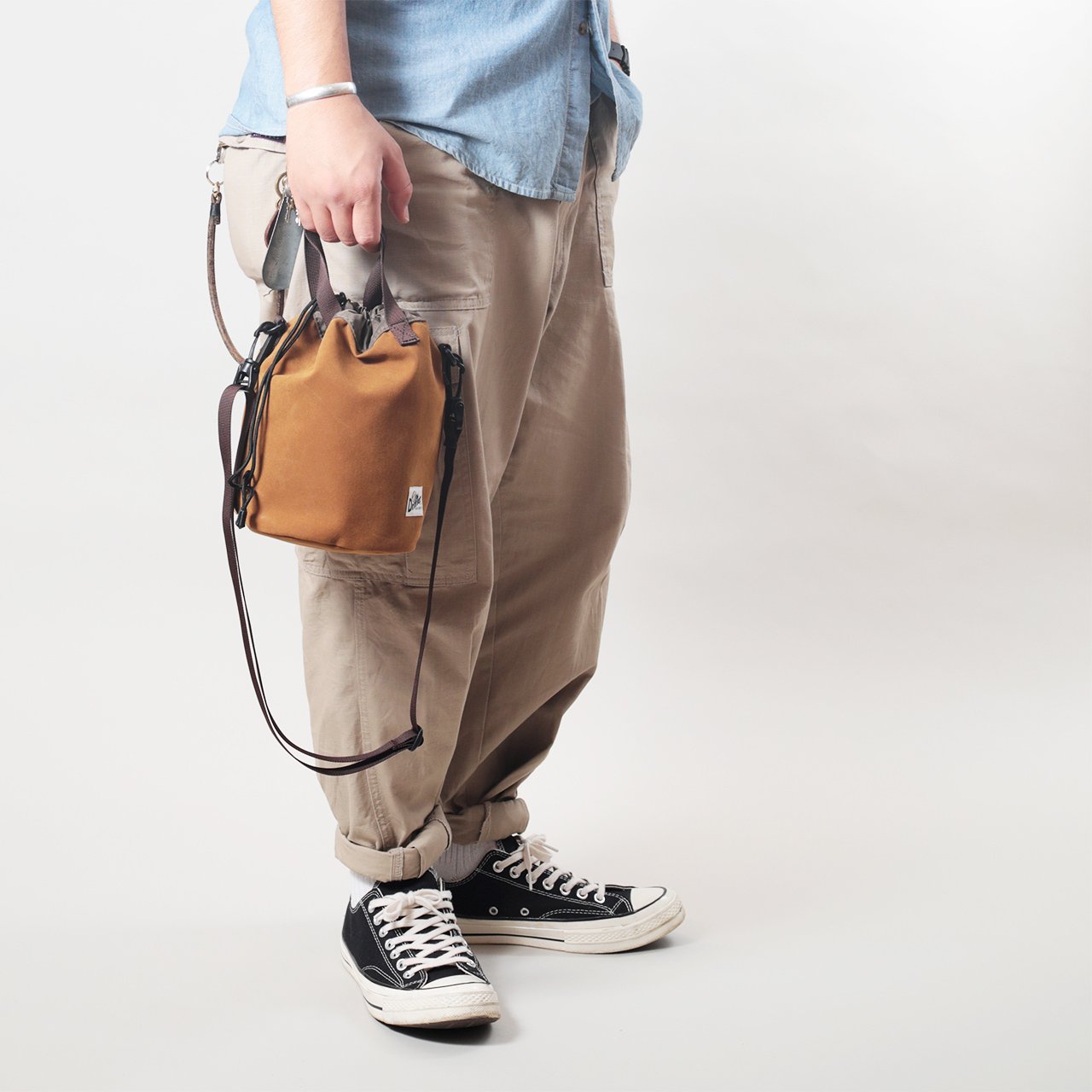A cute drawstring bag with a circular bottom. The main features are that the bag can be tightened with a drawcord and can be used in 2 ways (handheld or shoulder). The shoulder strap is removable, and you can put it in the main bag and use it as a pouch.