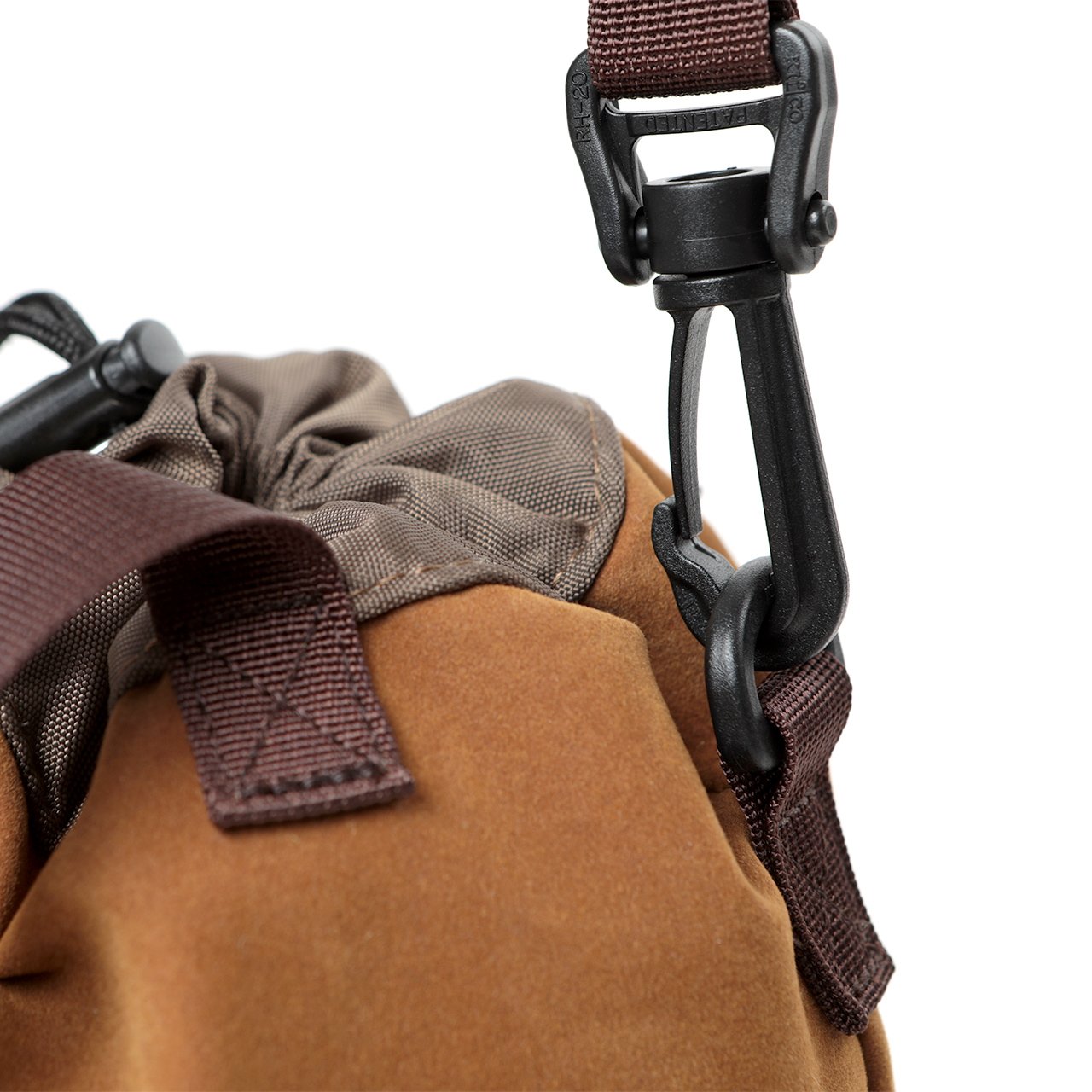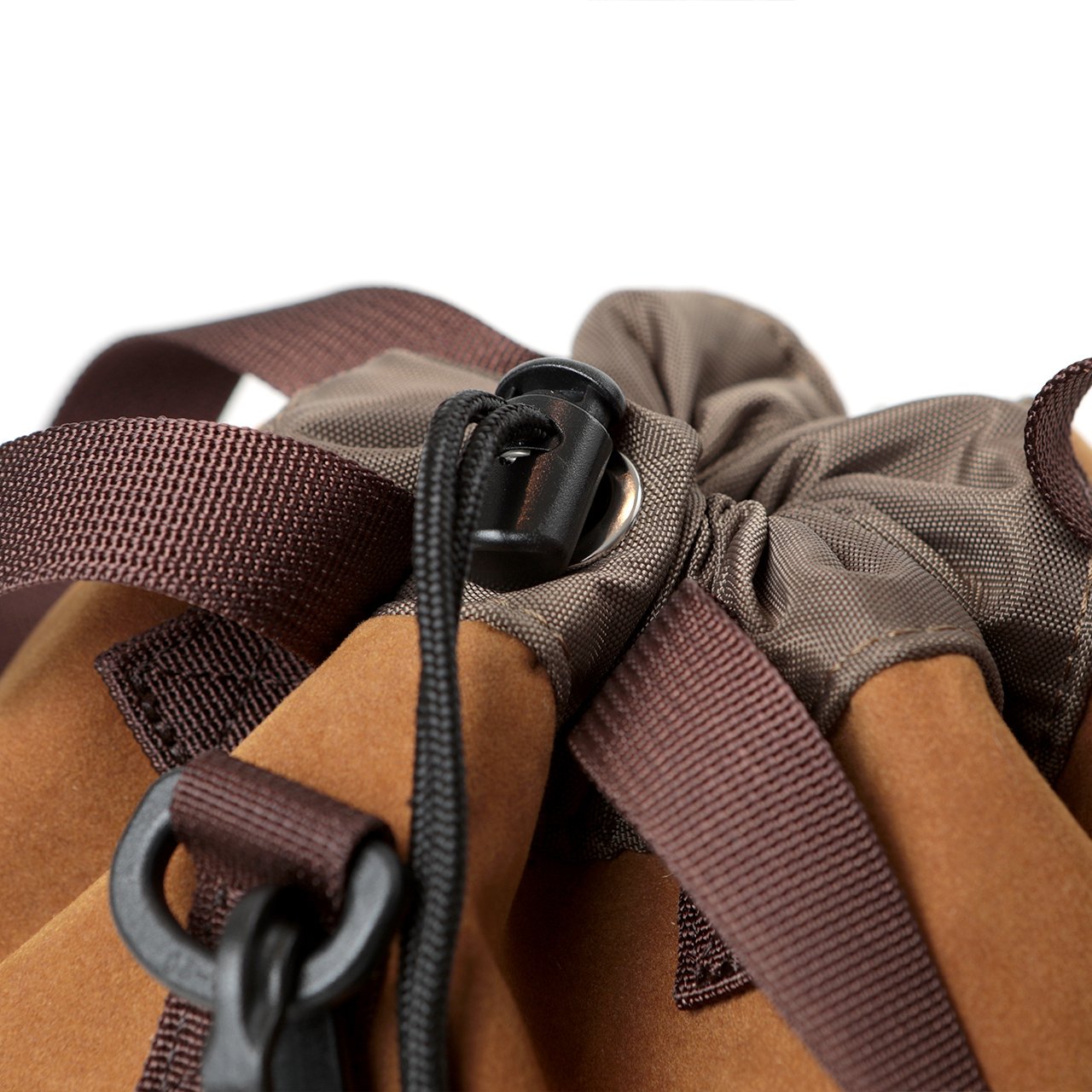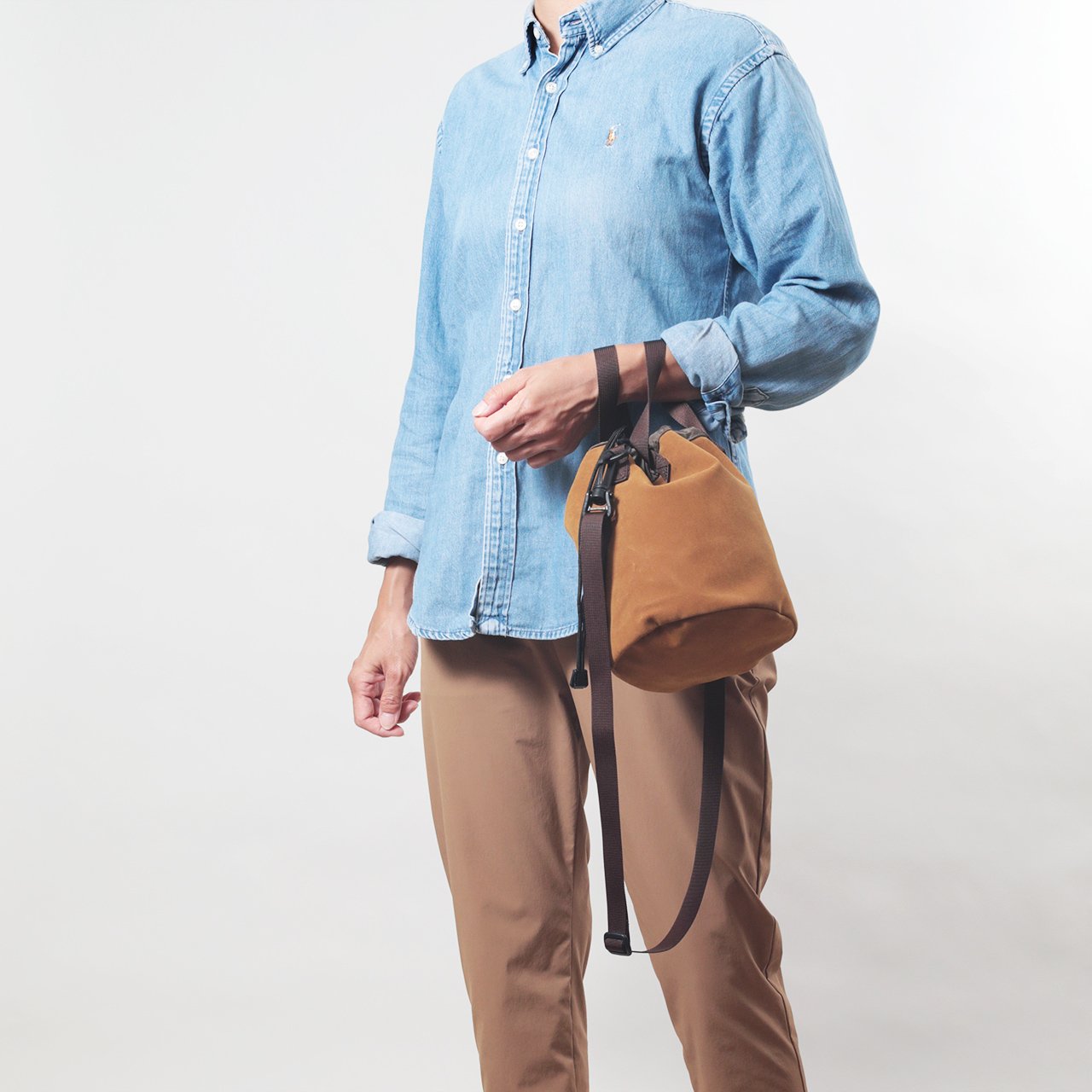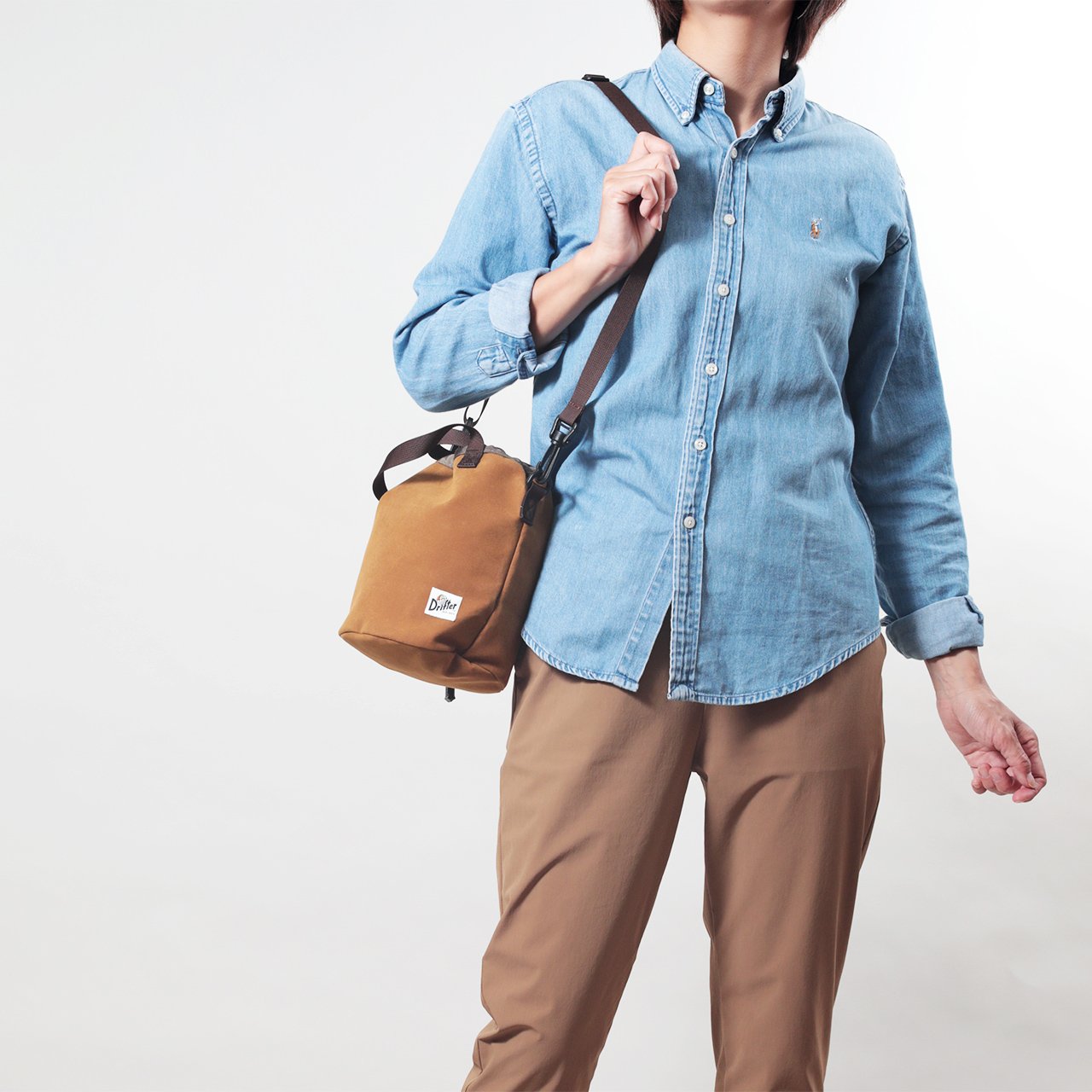 A cute drawstring bag with a circular bottom. The main features are that the bag can be tightened with a drawcord and can be used in 2 ways (handheld or shoulder). The shoulder strap is removable, and you can put it in the main bag and use it as a pouch.