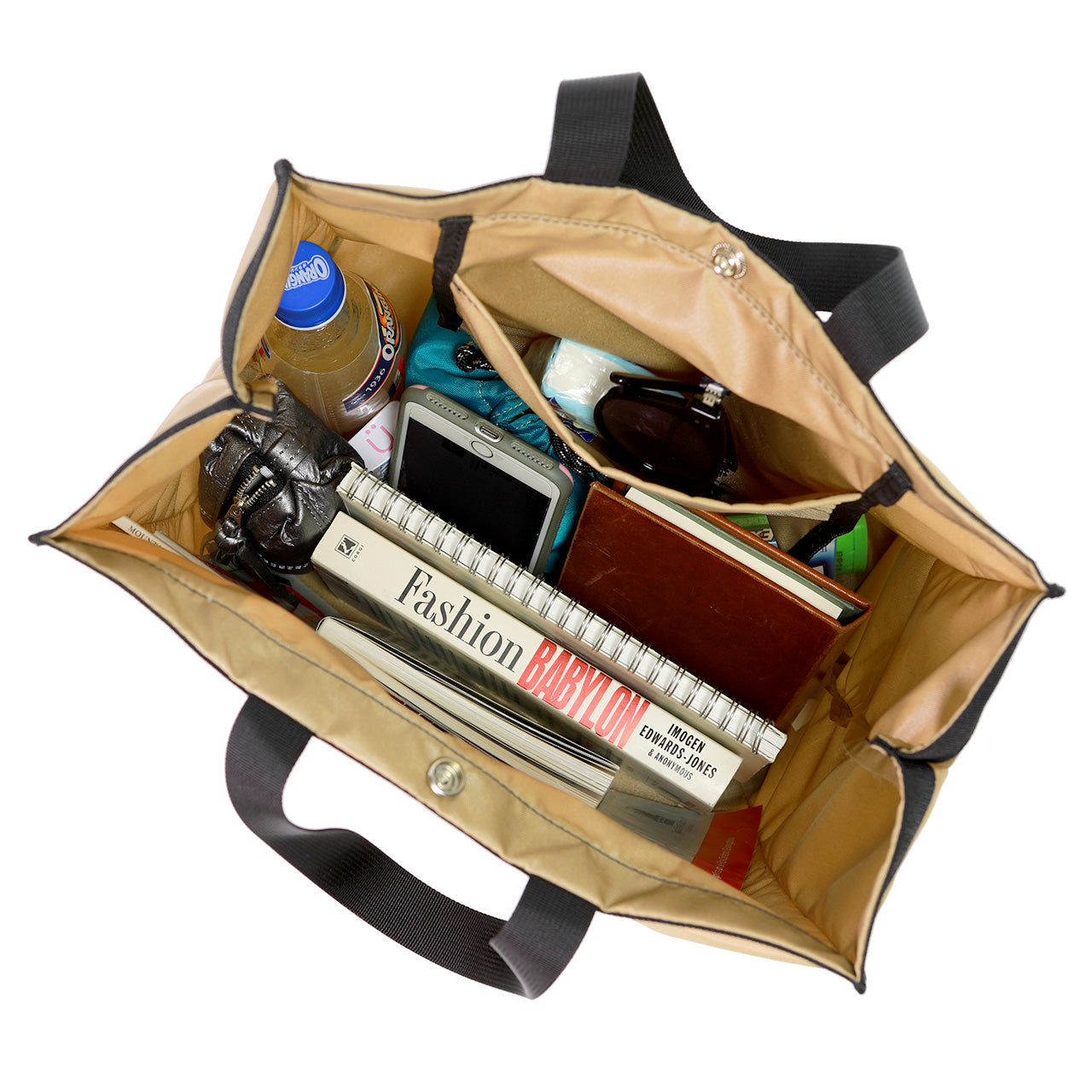 A simple tote bag shaped like a paper bag. The top has a snap button opening and closing, and the inside is equipped with an open pocket. Because it has a gusset, it has a considerable storage capacity and is useful not only for everyday use (commuting to work or school), but also for travel. It is also large enough to be used as an eco-bag for shopping, but it can also be neatly folded for storage. The color variations are abundant, and you will never get tired of the basic colors that creates a calming atmosphere and that are made of nylon material.